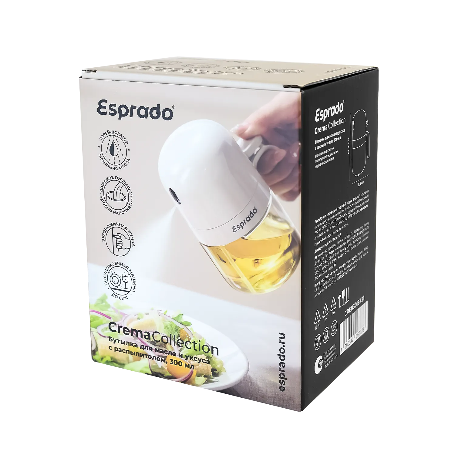 Спрей-дозатор позволяет равномерно распределить масло, уксус, другую заправку по блюду или в сковороде. Эргономичная ручка не скользит в руках. Широкое горлышко для удобного наполнения и мытья бутылки. Можно мыть в посудомоечной машине.