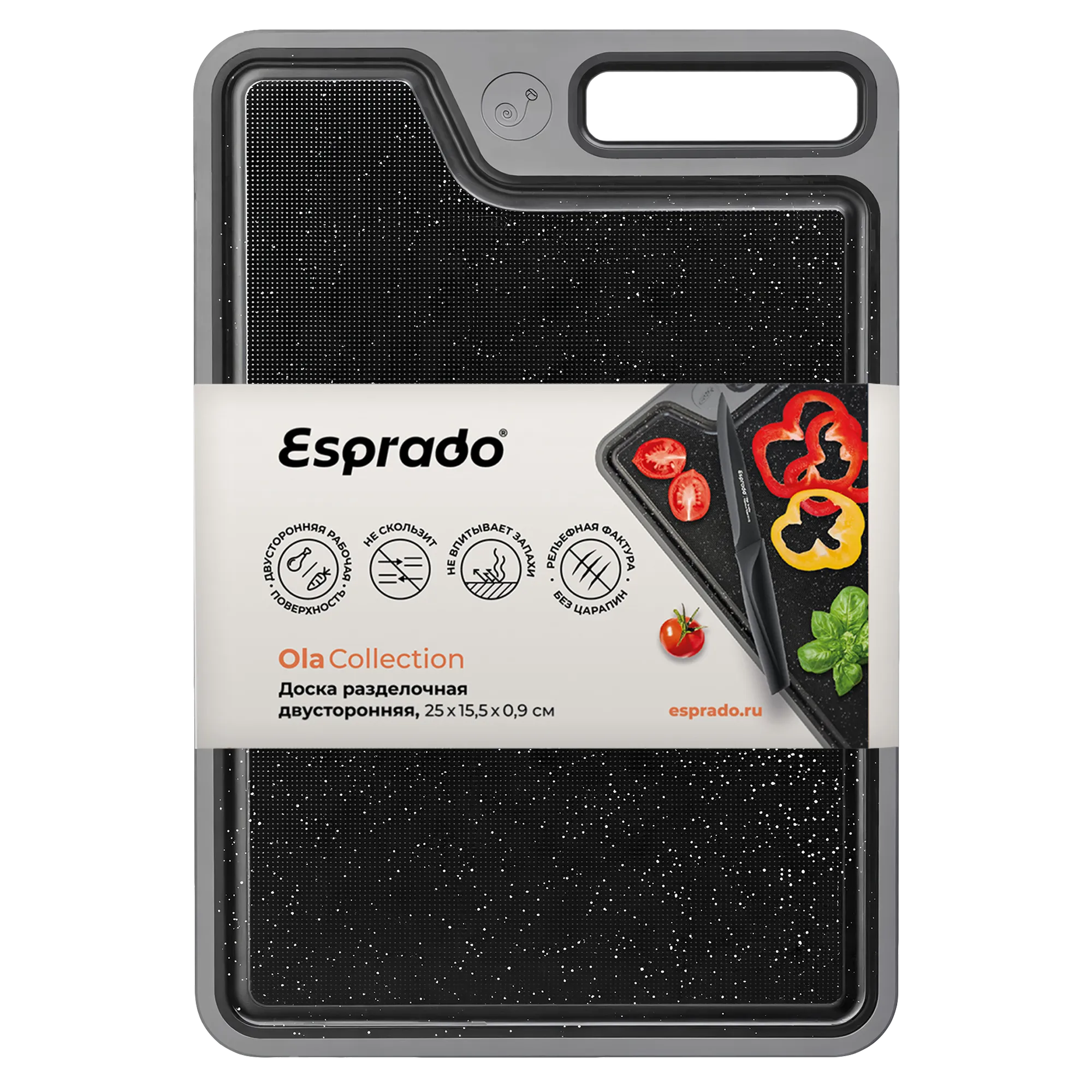 Изготовлена из термостойкого пластика. Доска легкая и устойчивая. Двусторонняя рабочая поверхность: значок овощей и мяса для раздельного использования. Не скользит на столе благодаря прорезиненному канту по краям доски.
