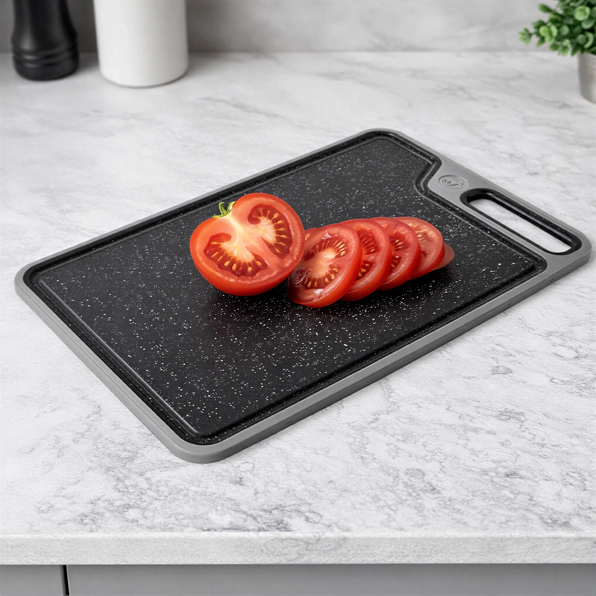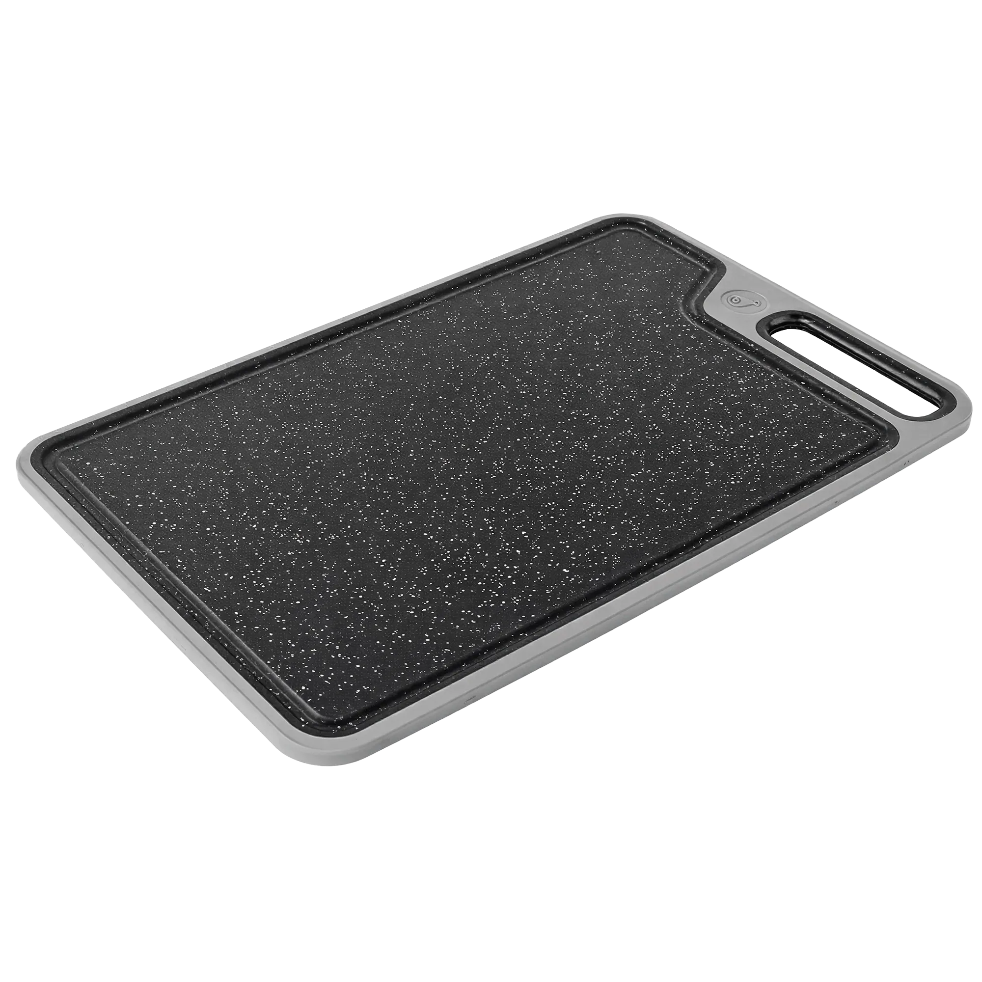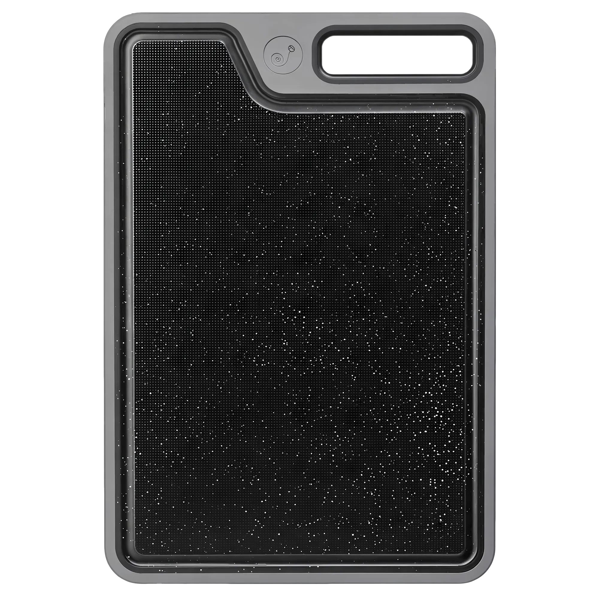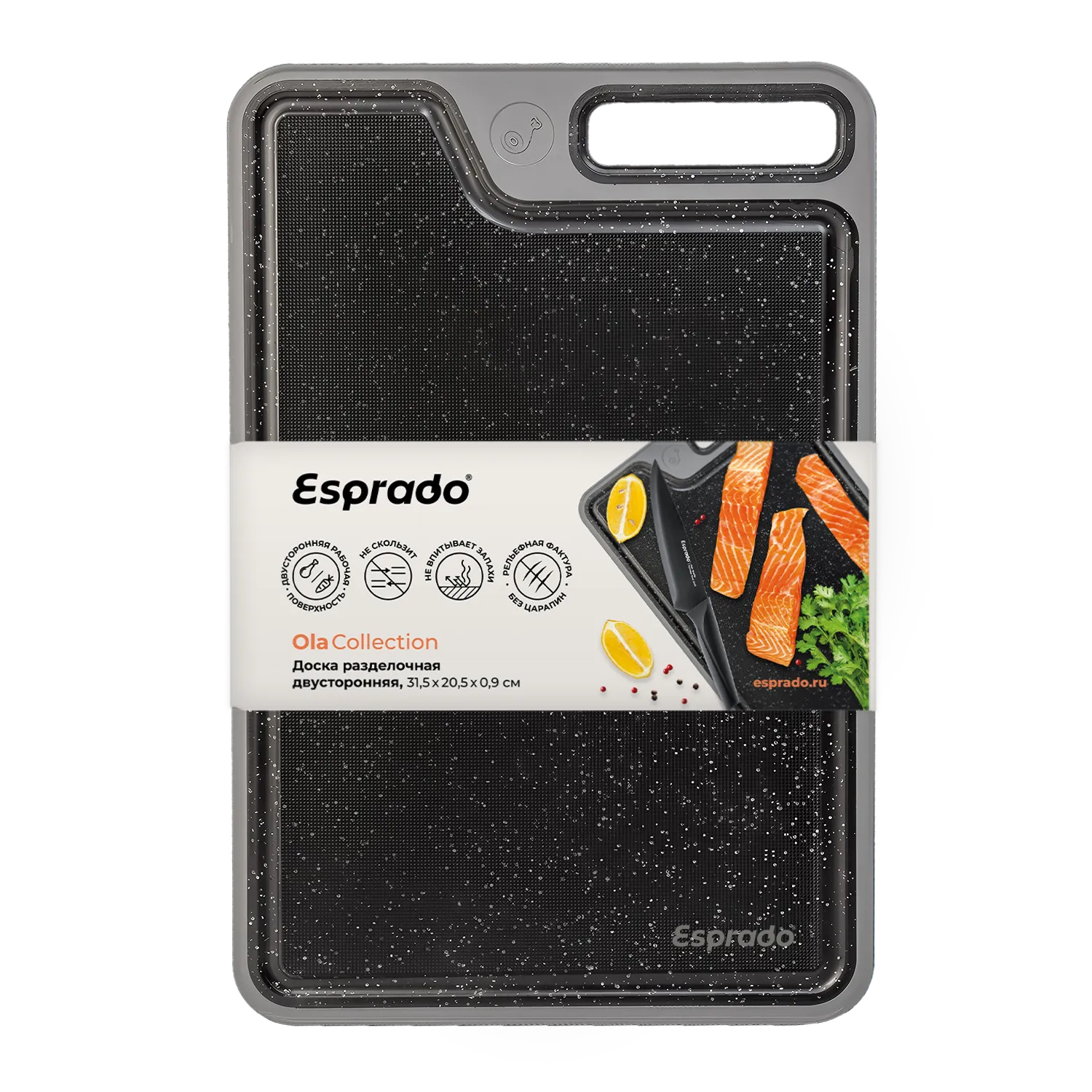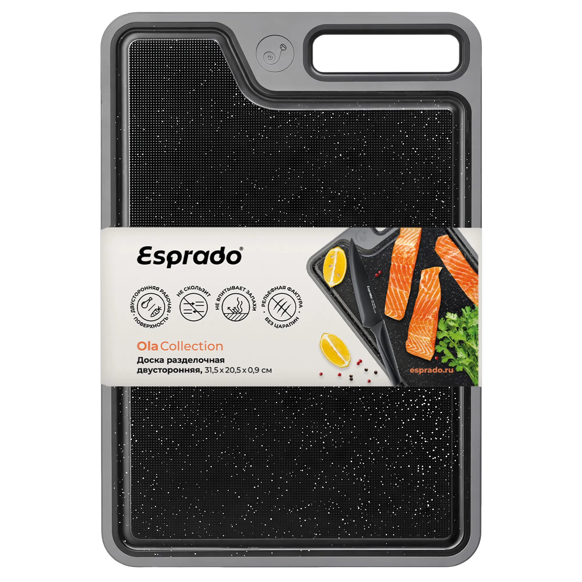 Изготовлена из термостойкого пластика. Доска легкая и устойчивая. Двусторонняя рабочая поверхность: значок овощей и мяса для раздельного использования. Не скользит на столе благодаря прорезиненному канту по краям доски.