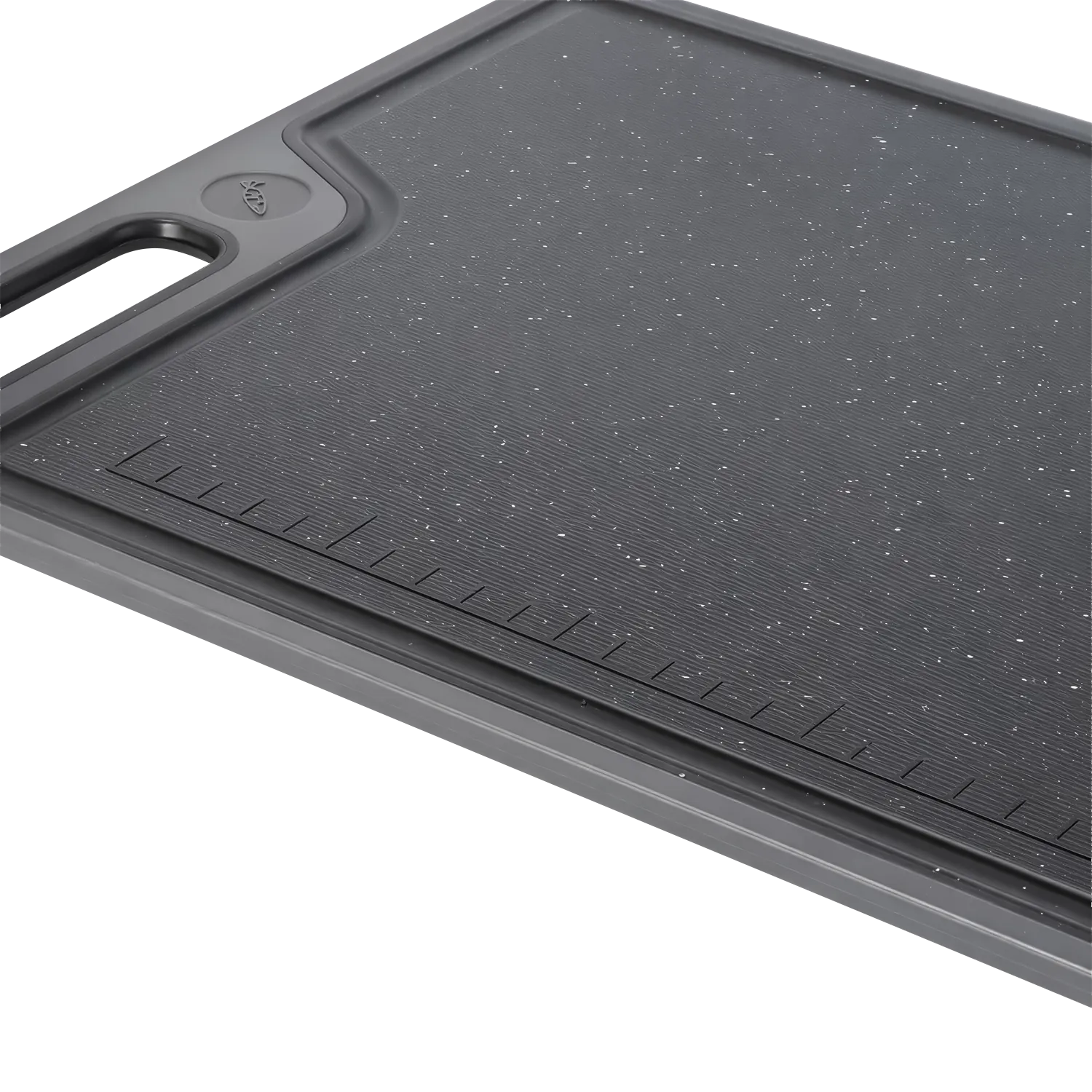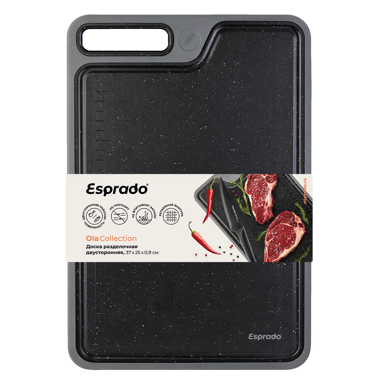Изготовлена из термостойкого пластика. Встроенная линейка для нарезки. Двусторонняя рабочая поверхность: значок овощей и мяса для раздельного использования. Не скользит на столе благодаря прорезиненному канту по краям доски.