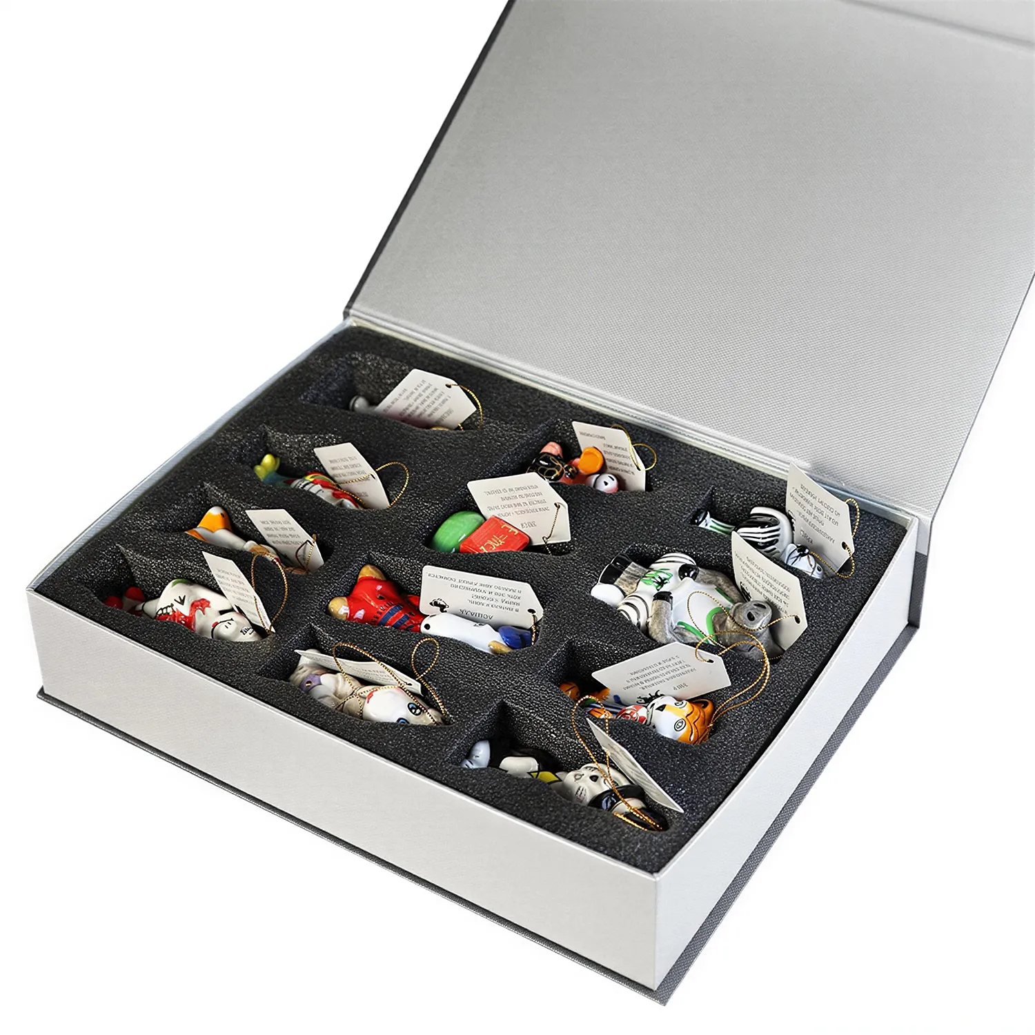Игрушки расписаны вручную, мелкие детали выделены золотом. Дизайн и неповторимый образ разработаны российскими художниками. У каждого символа есть ярлычок со стихотворением про него. Порадуйте близких игрушками в роскошной подарочной упаковке!