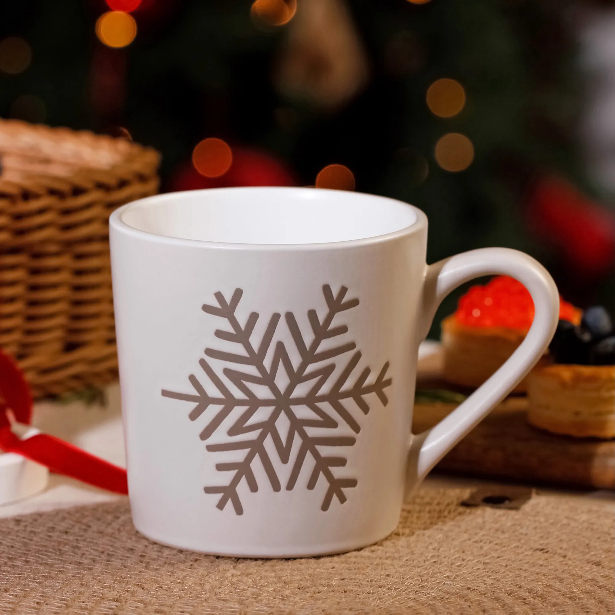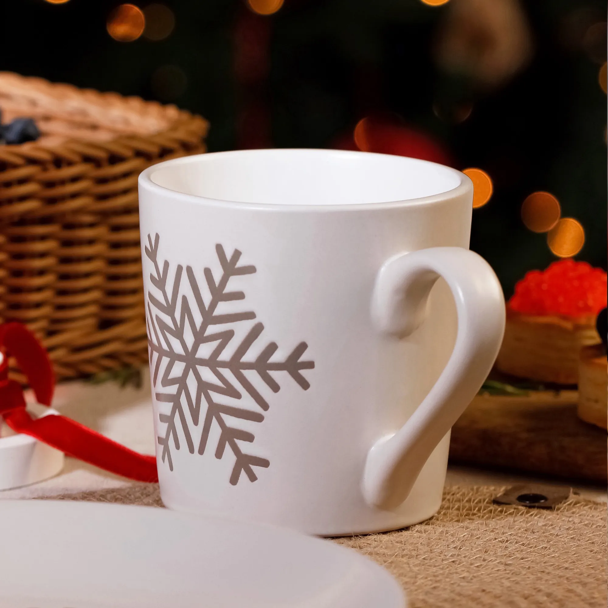 Минималистичное сочетание молочного белого и бежевого рельефного узора в виде снежинок. Сделано из прочной каменной керамики. Можно мыть в посудомоечной машине и греть в микроволновой печи.