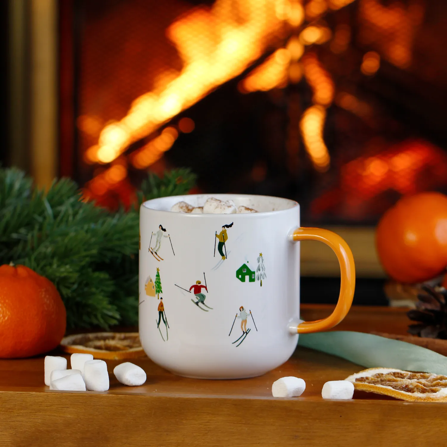 Кружка из прочной керамики с изображением лыжников. Насыщенные цвета и четкая прорисовка. Удобная ручка и объём. Можно греть в микроволновой печи и мыть в посудомоечной машине.