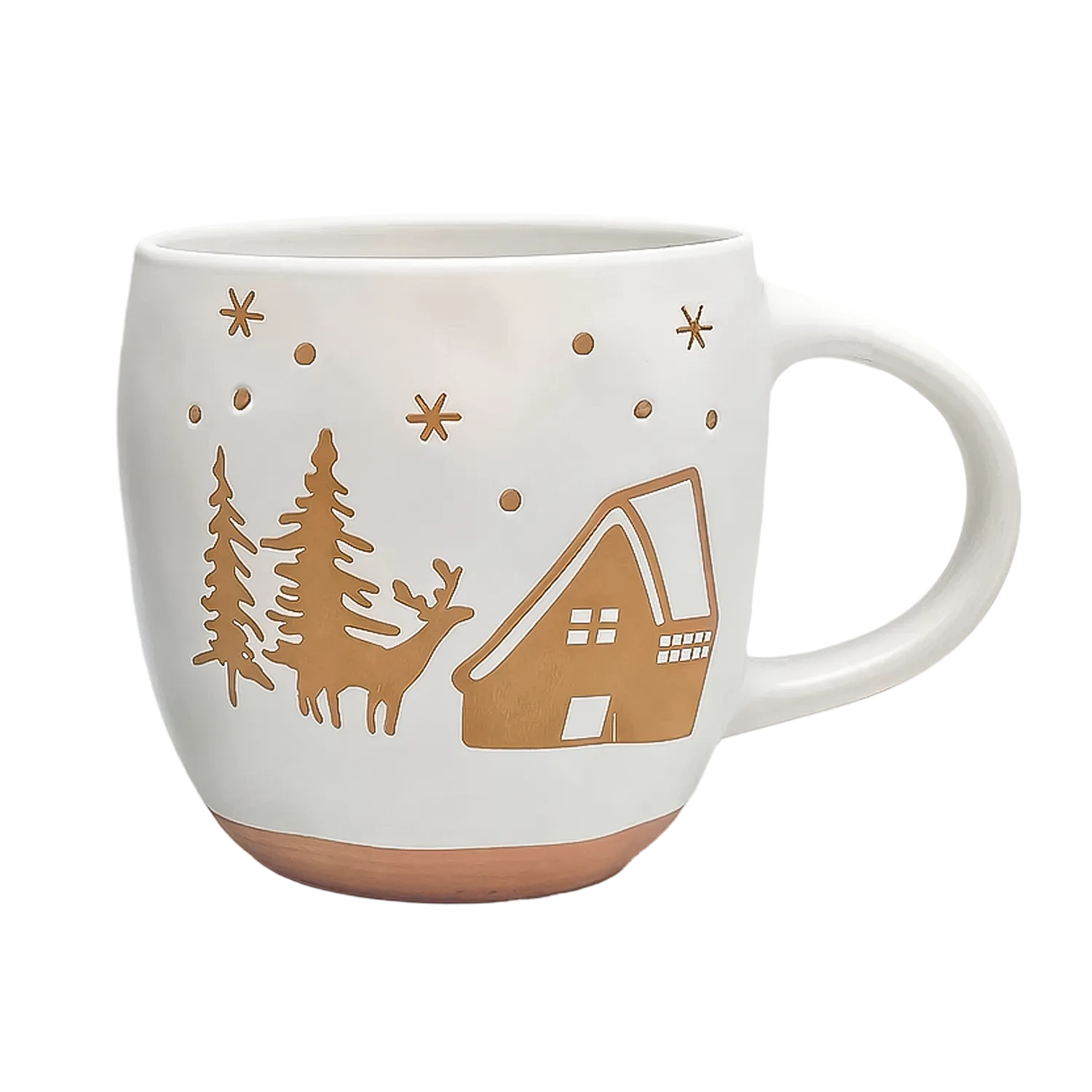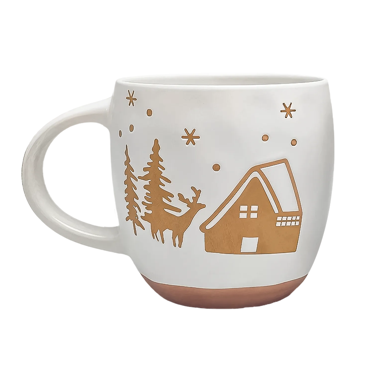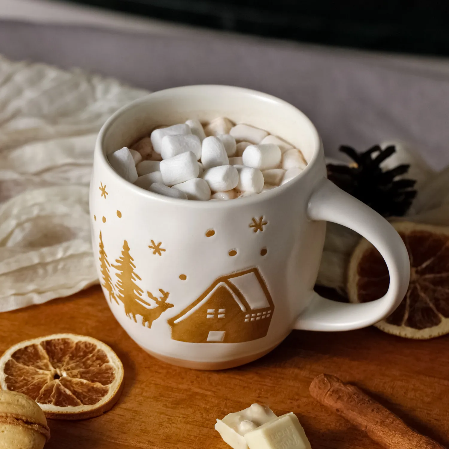 Милый дизайн бежевого цвета с рисунком зимнего домика. Ручка удобной формы. Большой объем. Сделано из прочной каменной керамики. Можно греть в микроволновой печи и мыть в посудомоечной машине.