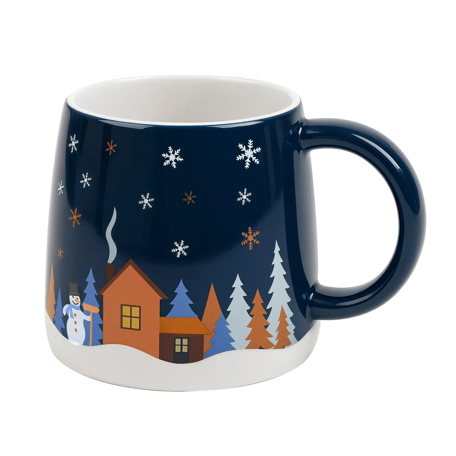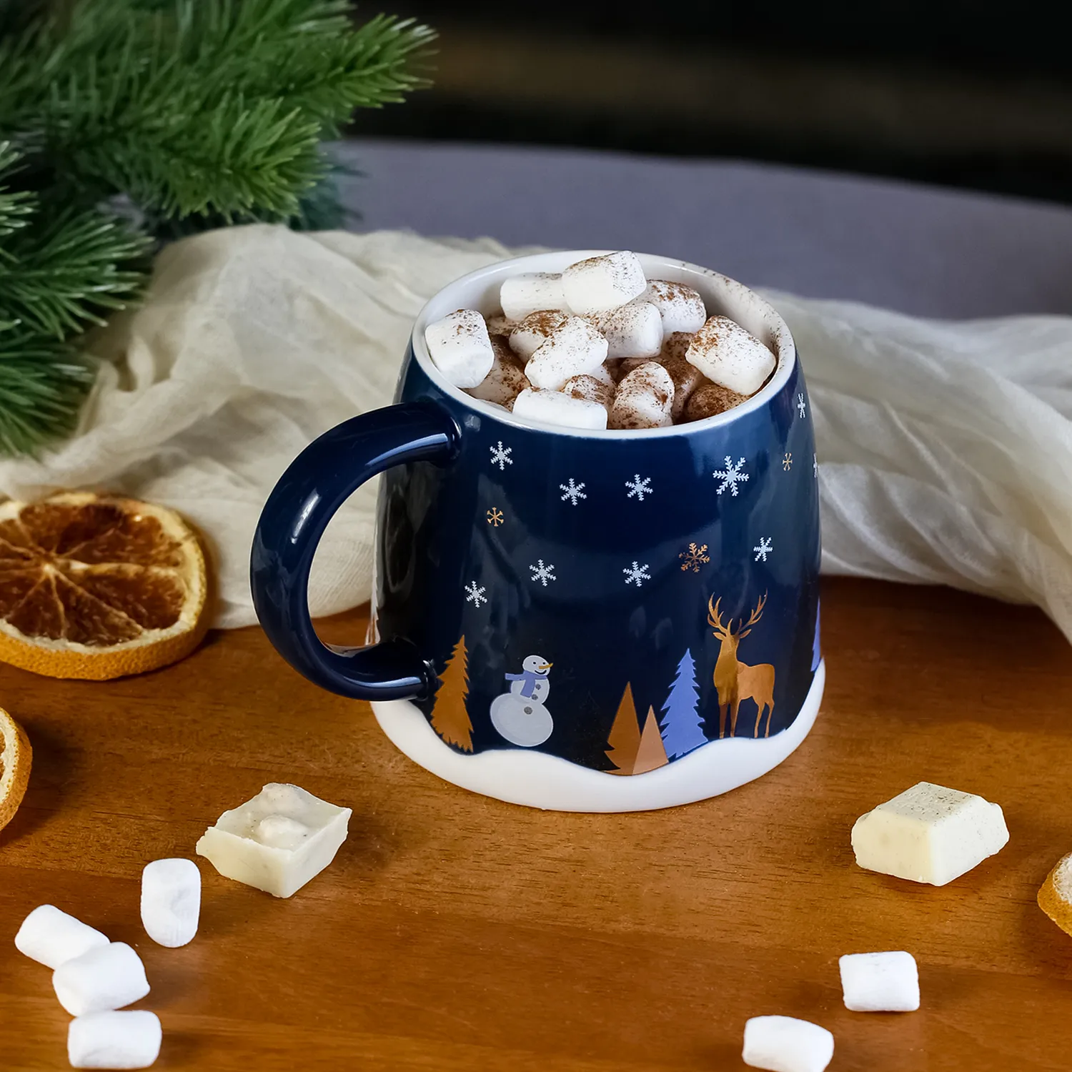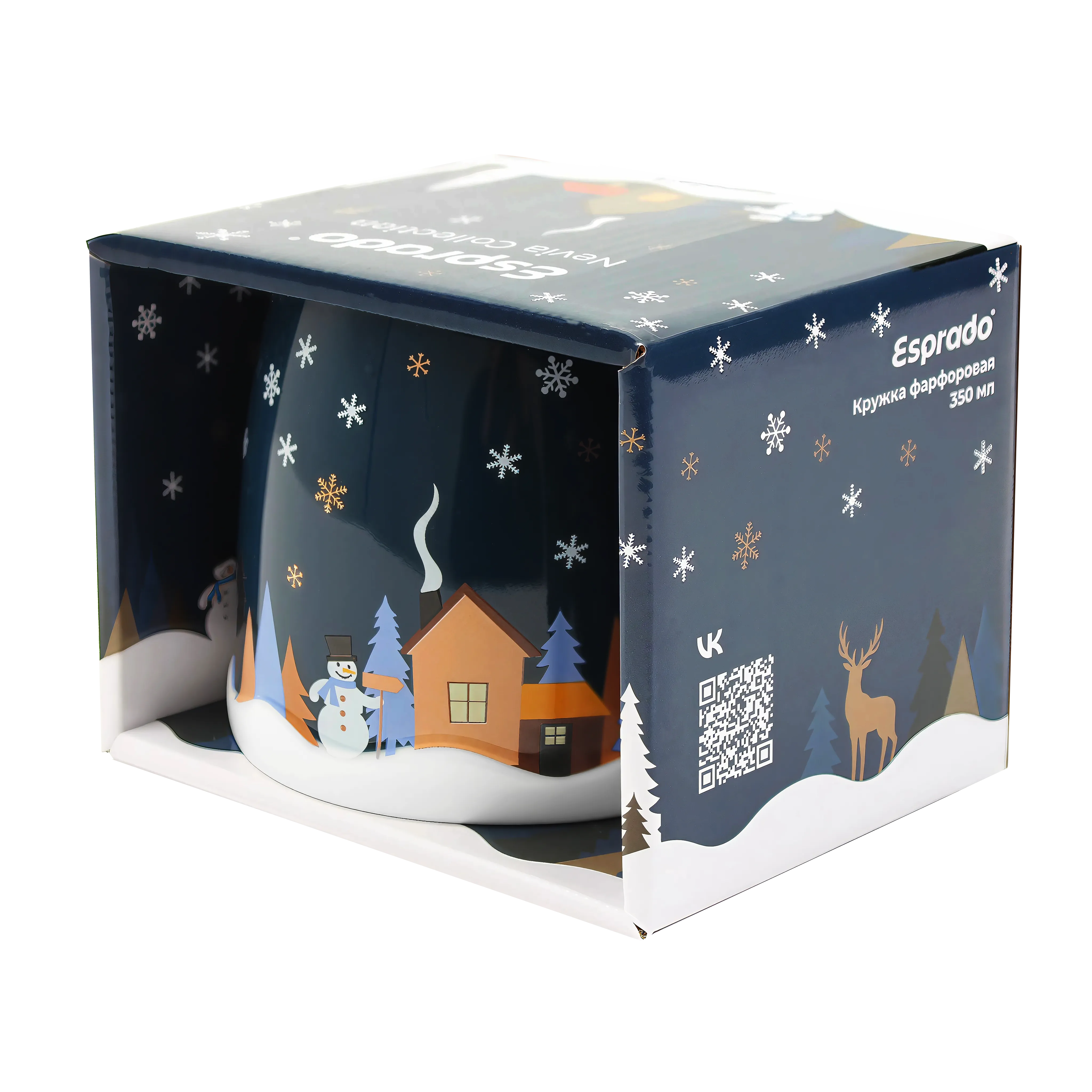 Елки, снеговик, домик, а также выделенные металликом снежинки и олень — настоящая зимняя сказка! Кружке добавляют очарования рельефные снежные сугробы. Яркая подарочная коробка — идеальный вариант для подарков!