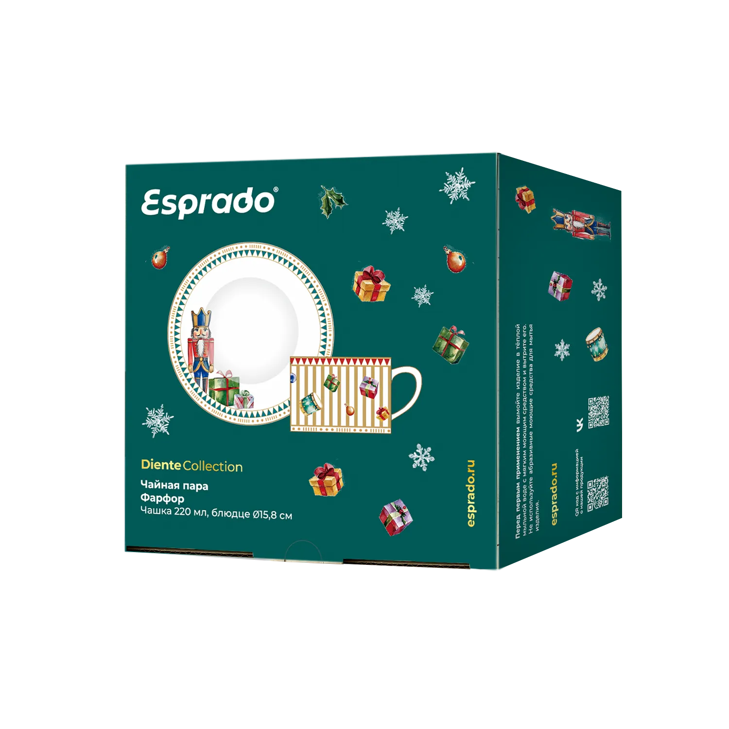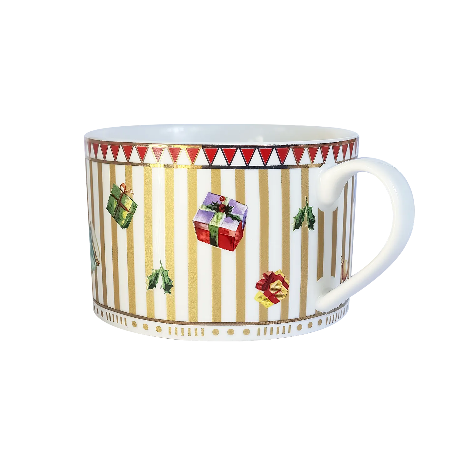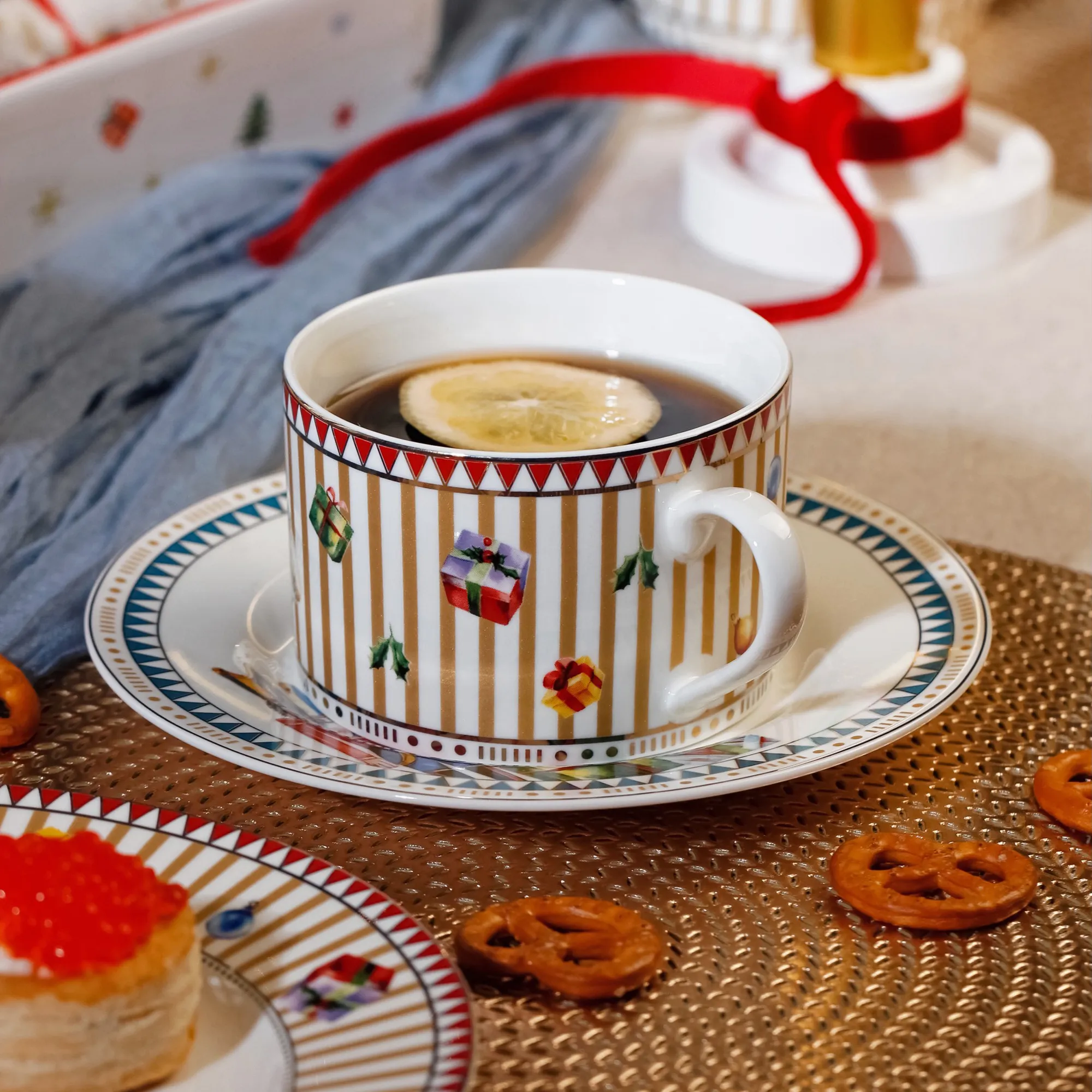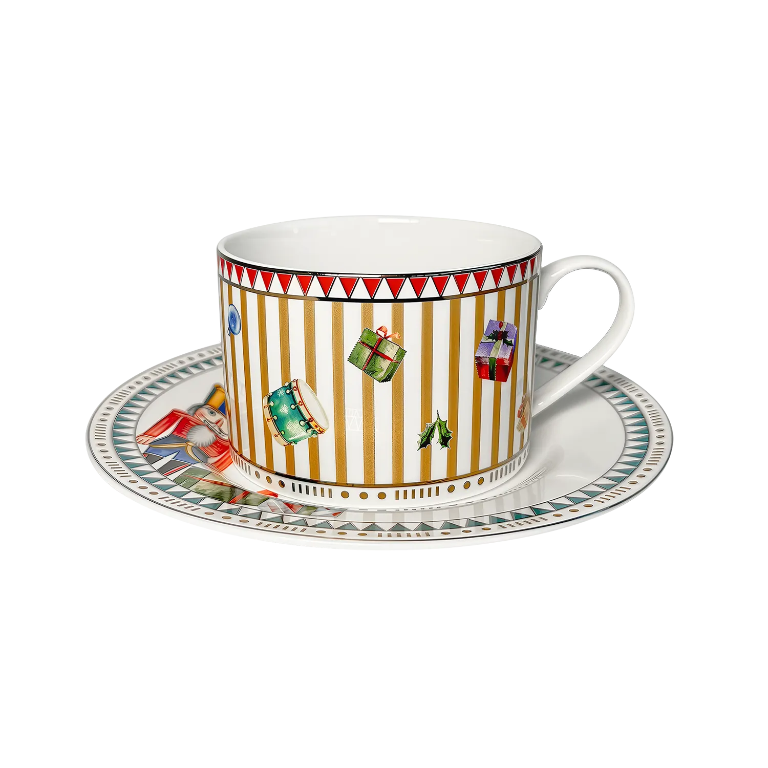 Тонкий, легкий фарфор классической формы. Сказочная новогодняя деколь с щелкунчиками, подарками и елочными игрушками сделает каждую трапезу особенной. Золотая отводка придаёт каждой детали праздничный блеск.