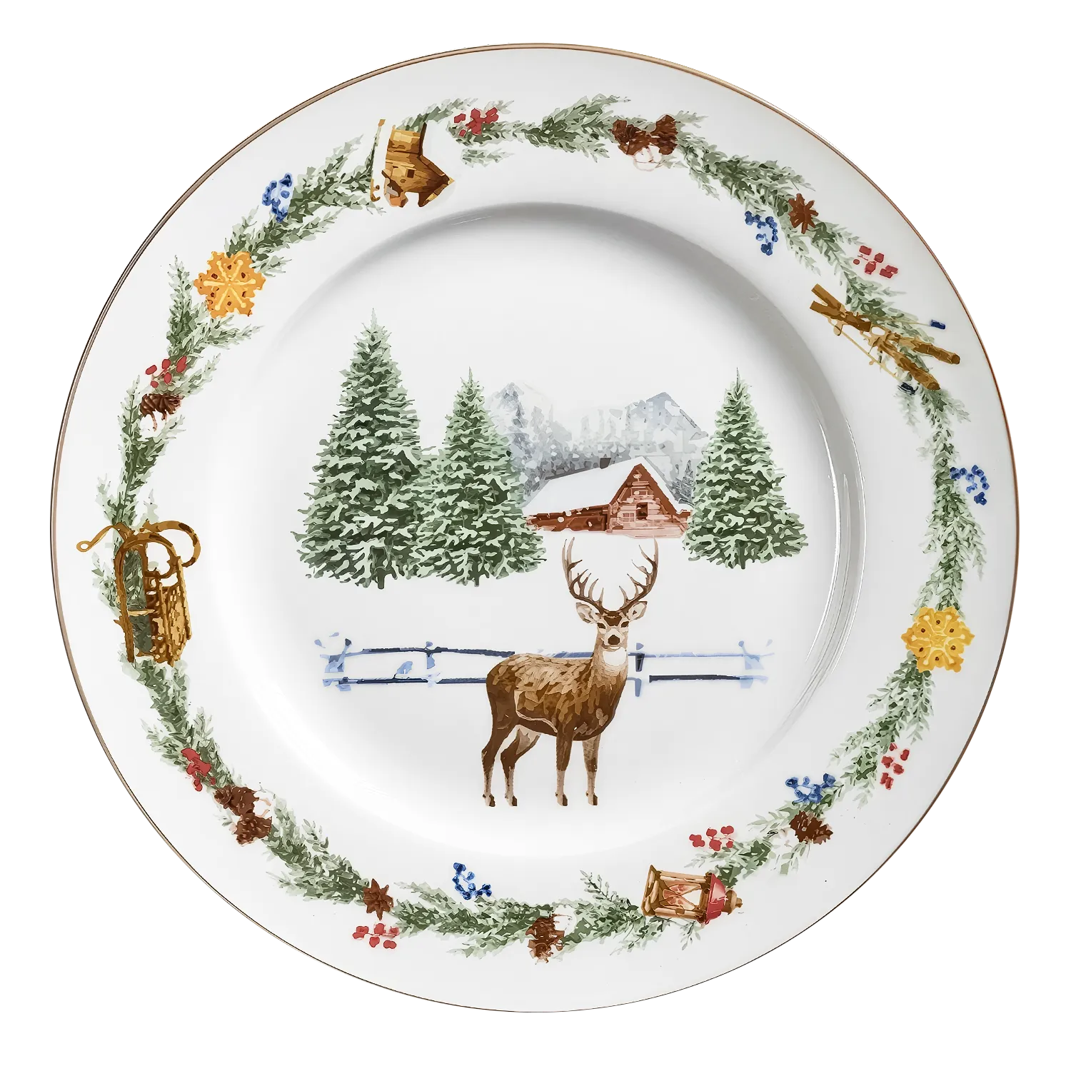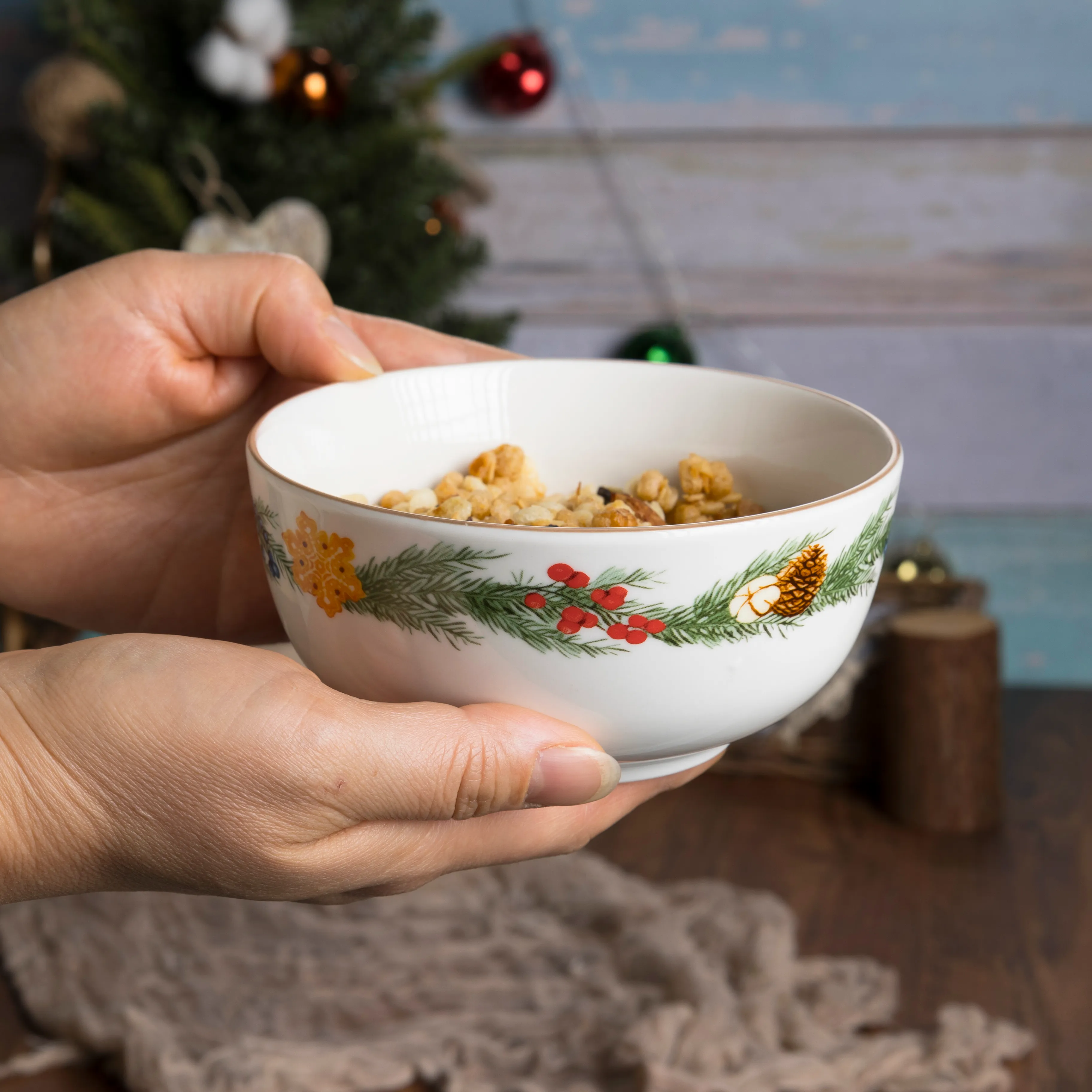 Новогодний орнамент в виде еловых веток и других зимних символов украшает салатник. Коричневая отводка аккуратно выделяет посуду. Подойдет как для повседневной, так и для праздничной сервировки. Можно мыть в посудомоечной машине и греть в микроволновой печи.