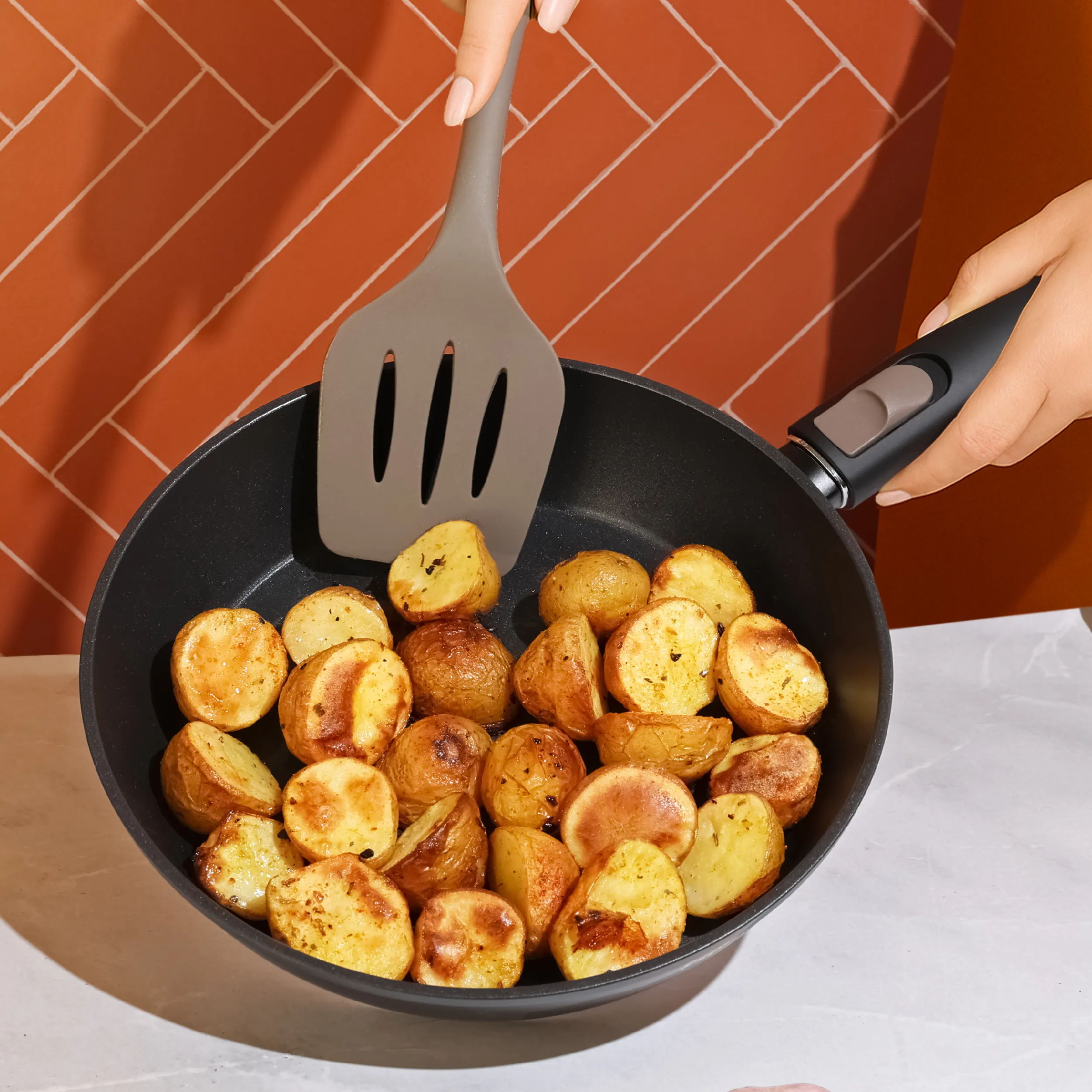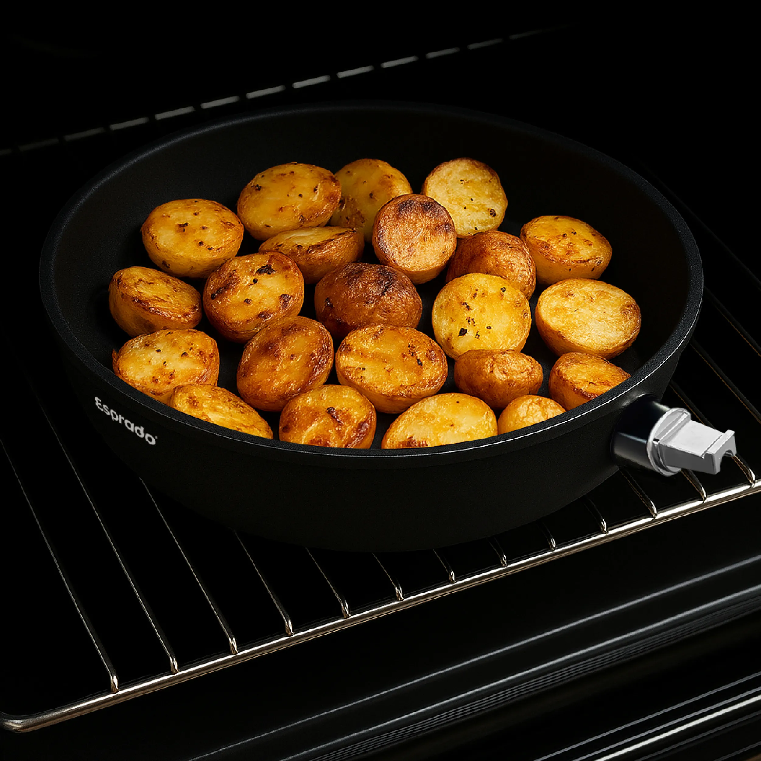 Высокие стенки и большая рабочая поверхность. Двухслойное антипригарное покрытие защищает пищу от пригорания. Стильное черное покрытие как внутри, так и снаружи. Съемная ручка позволяет использовать сковороду как форму для запекания.
