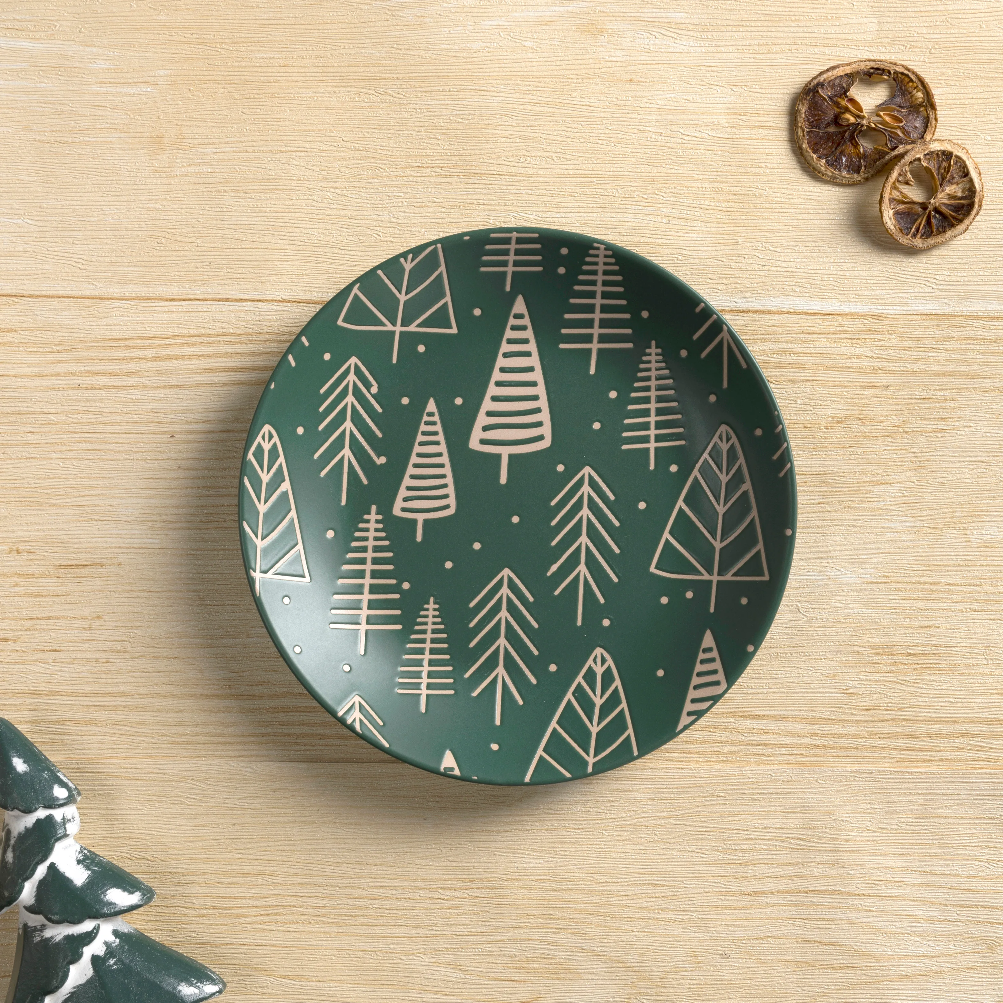 Насыщенный зеленый цвет с контрастным рельефным узором в виде елок. Сделано из прочной каменной керамики. Чудесно сочетается с посудой Abeto белого цвета. Можно мыть в посудомоечной машине и греть в микроволновой печи.