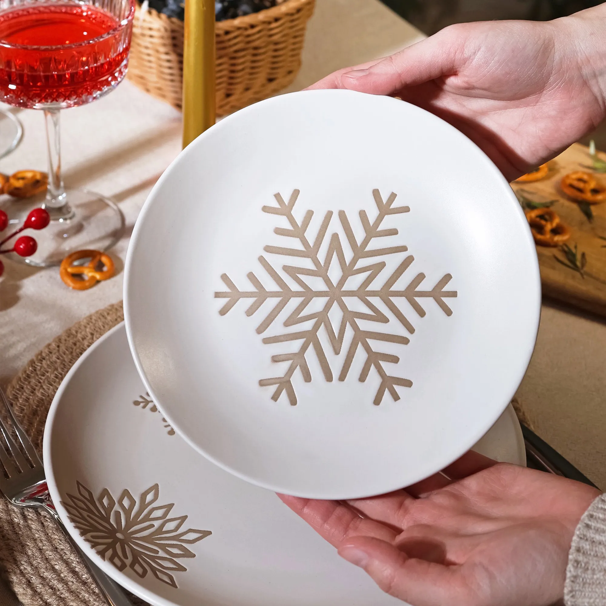 Минималистичное сочетание молочного белого и бежевого рельефного узора в виде снежинок. Сделано из прочной каменной керамики. Можно мыть в посудомоечной машине и греть в микроволновой печи.
