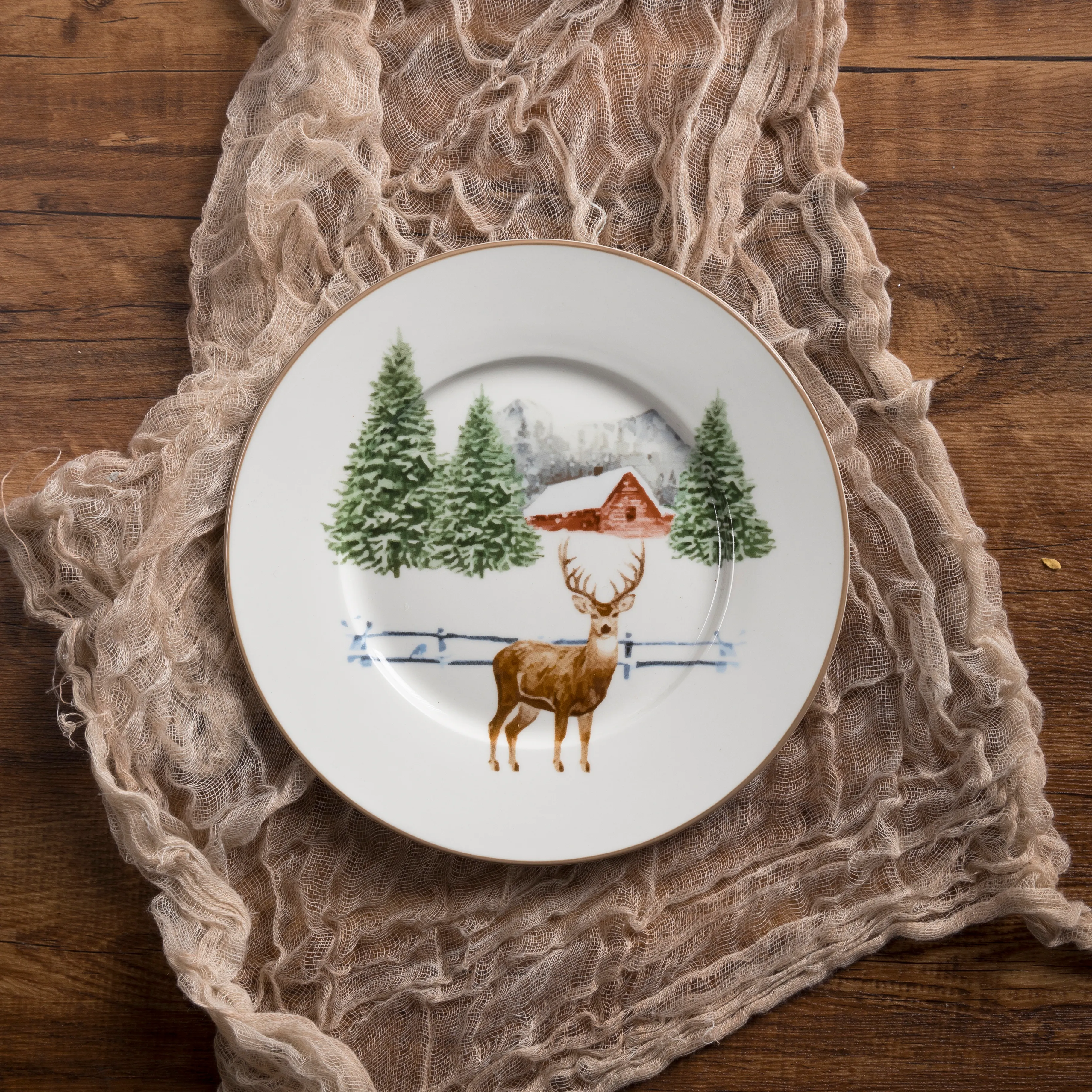 Тарелка украшена деколью с изображением благородного оленя на фоне зимнего пейзажа. Коричневая отводка аккуратно выделяет посуду. Подойдет как для повседневной, так и для праздничной сервировки. Можно мыть в посудомоечной машине и греть в микроволновой печи.