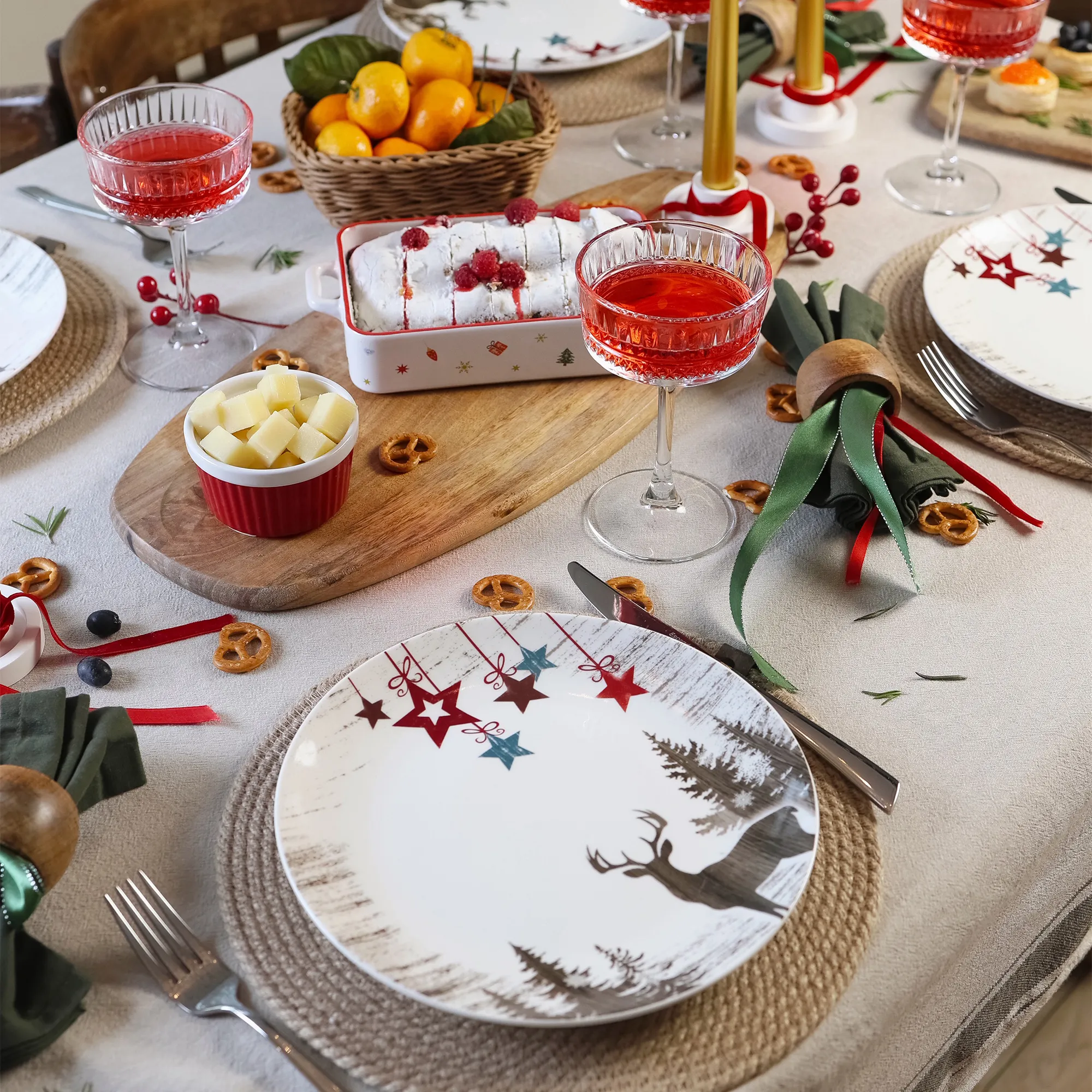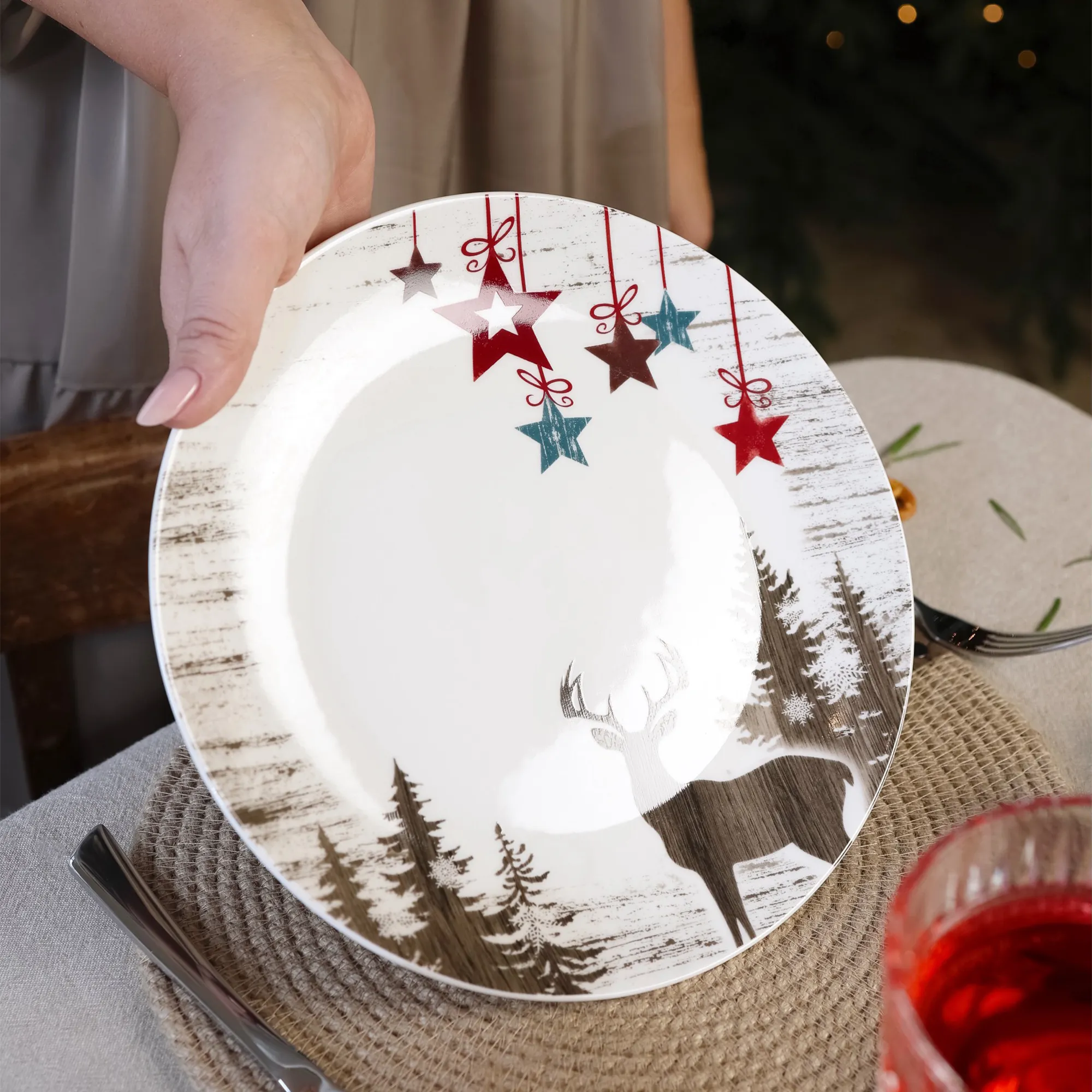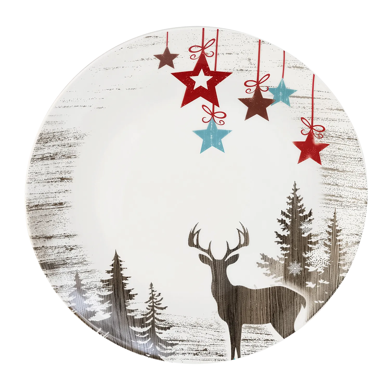 Деколь с коричневыми оленями и елками подойдет под уютный интерьер. Акцентные красные и голубые звезды привлекают внимание. Посуда подойдет для повседневной и праздничной сервировки. Можно мыть в посудомоечной машине.