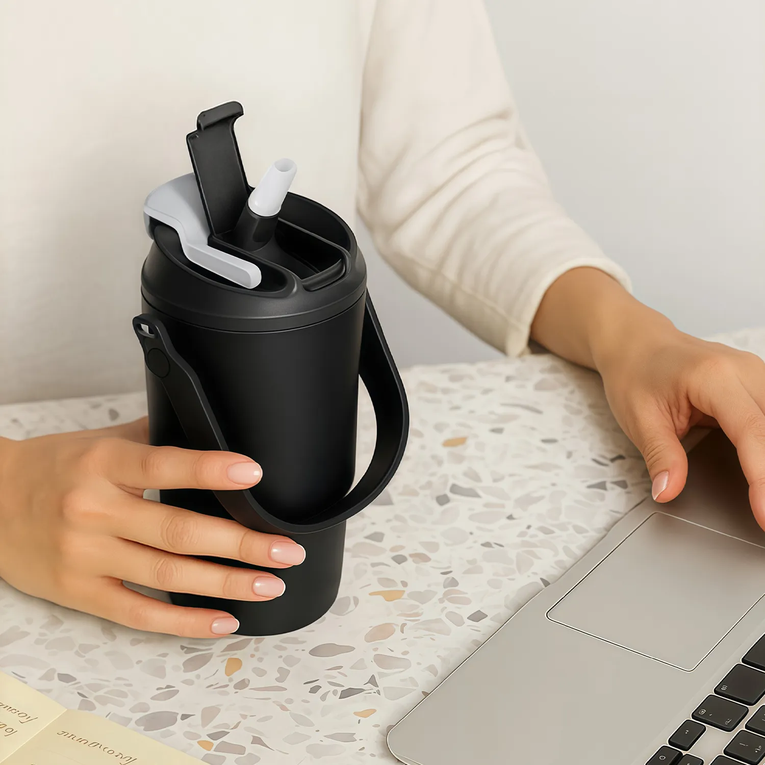 Сохраняет тепло в течение 6 часов, холод — до 12 часов, а со льдом — до 30 часов. Подходит для автомобильного подстаканника. Можно прикрепить декоративный ремень. Доступны два способа питья: через соломинку или напрямую. Герметичная конструкция с вакуумной изоляцией. Колба из нержавеющей стали марки 304. Силиконовое основание.